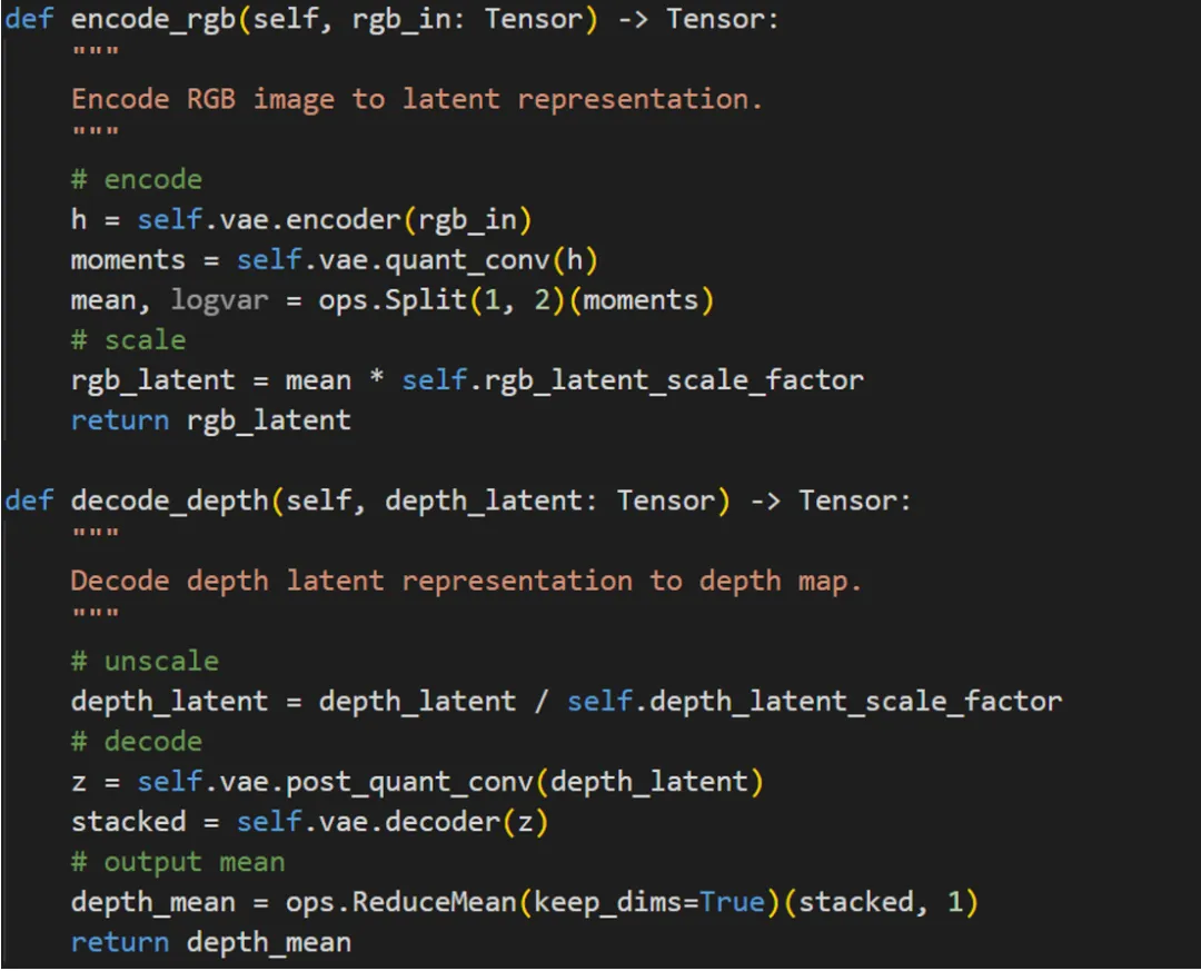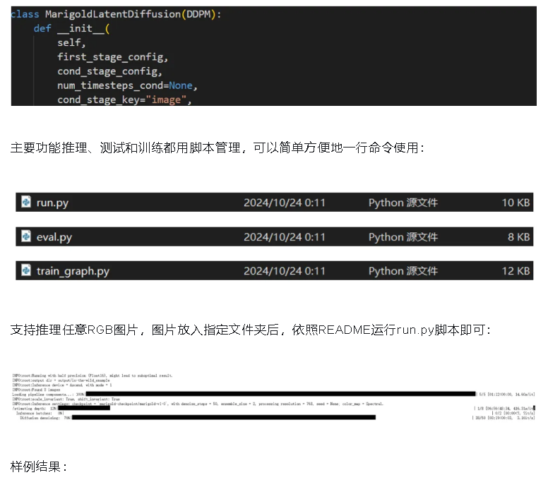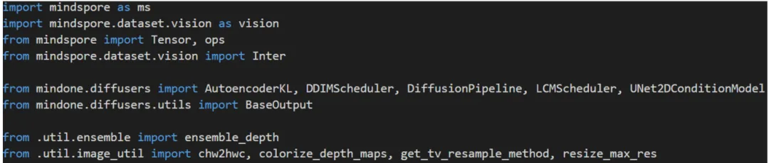 推理主要使用的MarigoldPipeline,继承自DiffusionPipeline,对应的VAE、UNet、Scheduler在mindone的diffuers中都有定义,直接使用: