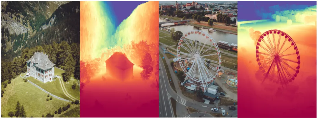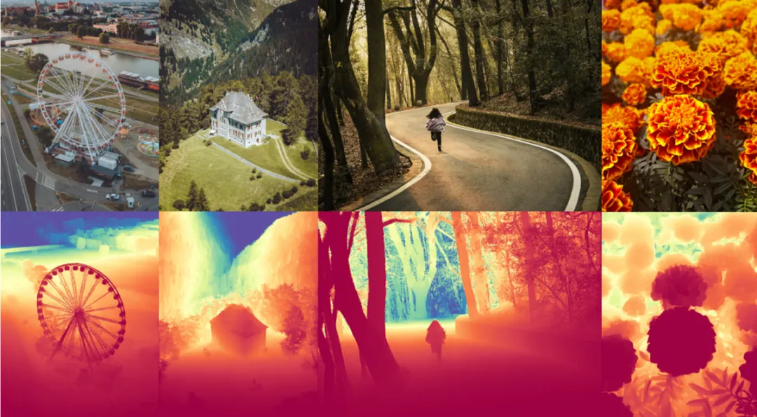 深度估计是对给定RGB图像预测相对深度图的任务,即对输入图像可以预测出所有像素位置到相机的相对远近(示例图中偏红更近,偏蓝更远)。