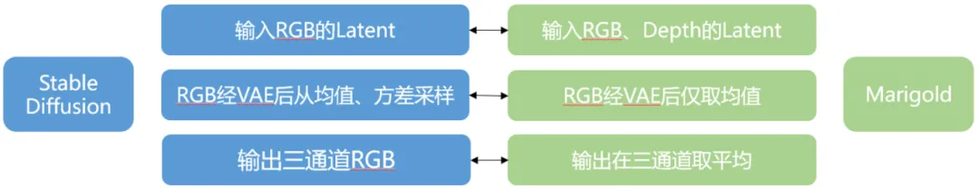 然后总结了Marigold相比Stable Diffusion推理的主要不同点: