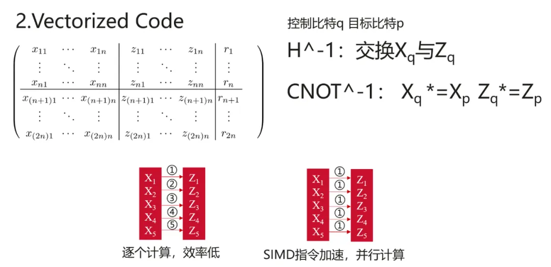 以H门为例,H^-1与tableau的计算,是Xq与Zq整行进行交换。其他大部分的量子逻辑门逆都是整行计算,现有的矩阵向量计算方案多为逐个元素计算,单线程操作,效率低下,面对量子比特大,量子电路复杂的情况,表现十分差。因此,采用SIMD指令优化加速计算过程,并行操作。