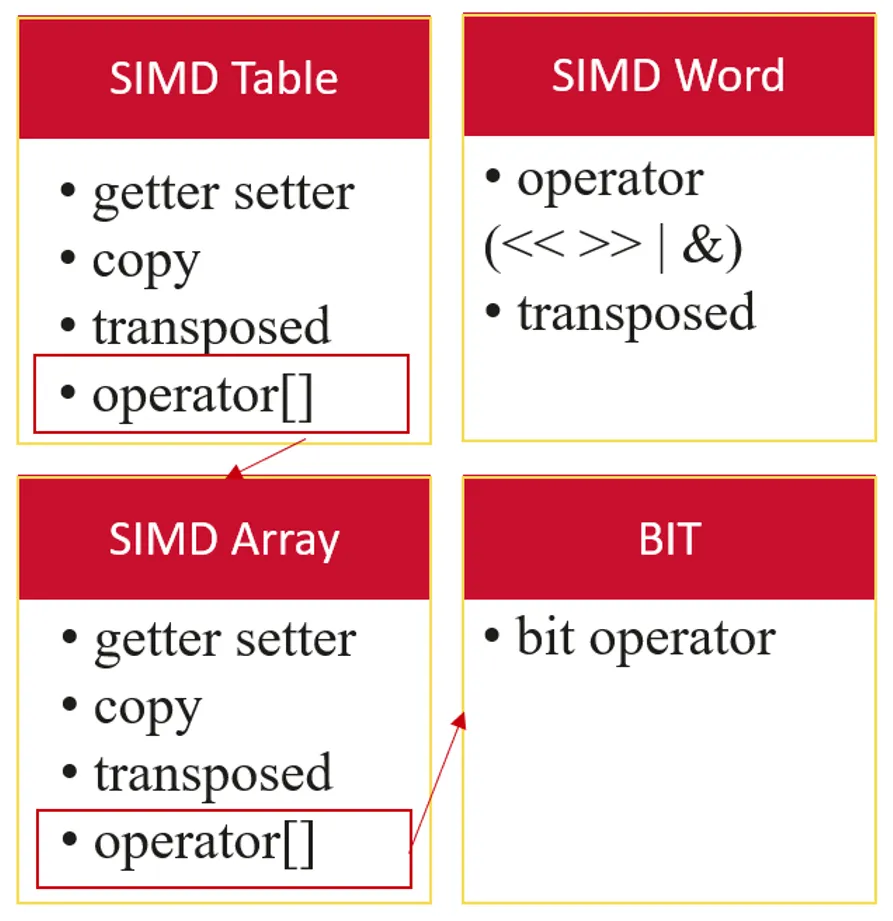 Tableau与量子逻辑门计算通过操作SIMDWord位运算实现。观察不同量子门的计算发现,一共有两种,对X或者Z行/列计算、逐位计算。因此,Tableau需要支持按行查询一整行该数据,同时支持按行按列查询该位存储数据,类似一个二维数据。针对以上需求,我封装了SIMDTable类、SIMDArray类,通过重载[]运算符,支持按行查询,返回结果为SIMDArray类。SIMDArray类中重载[]运算符,返回结果为SIMDWord中一个bit。