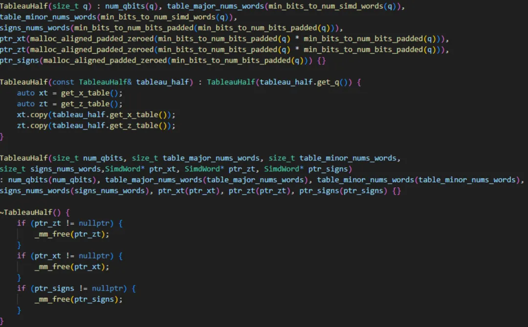 在梳理完需求后,剩下的工作内容就是代码复现和完善程序设计,值得一提的就是内存管理部分的优化设计,这也是由C++语言特性决定的。在初版代码中,由于理解不到位,我把内存的申请与内存的释放写在了SimdTable、SimdArray的析构函数中,但SIMDTable是一个中间变量,会多次调用,是根据SimdWord生成,这样会存在Tableau还需要运算,SIMDWord申请的内存已经释放的情况,导致内存泄漏。所以,内存申请释放应该写在Tableau的构造函数中,然后在Tableau中实现对XTable、ZTable、Phase的查询。
