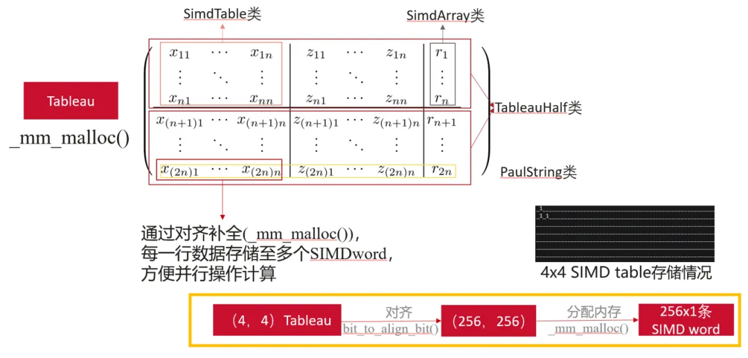 核心的数据结构是Tableau的设计,所有的操作实际上是针对Tableau 模拟。一个Tableau从数据结构的角度来理解,由X、Z、Phase三部分组成,是一个值全为0/1的二维矩阵,大小为(2n+1)*2n,n系统的量子比特数。其中X、Z大小为n*2n,Phase大小为n*1。如果用常用的数据类型(例如int类型)构建一个二维数组对Tableau进行存储,会造成存储空间的巨大浪费(值只有0/1,一个int类型消耗1byte的内存),并且计算效率低下(单线程)。针对存储空间优化,每个元素实际上只需要1bit的内存。针对计算效率优化,在原理解析已经介绍了SIMD指令多线程加速计算。在C++中,SIMD指令有相关的头文件(Linux系统下是)封装了相关数据类型及基本操作。
