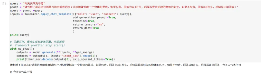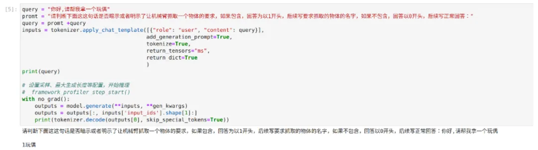 根据项目要求,本项目需要系统能对自然语言指令给出相对应的反应,所以特意引入了自然语言处理模块,该模块直接调用 mindnlp 中预训练好的 ChatGM4 聊天机器人。由于该模型不具有记忆模型的功能,需要通过提前嵌入好的提示词判断用户输入的语句中是否带有抓取指令的暗示,如果具有抓取指令的暗示,则回复特定的语句,通过判断回复的类型可以简单得出是否需要开启下一步的检测定位程序。图3和图4,给出了回复为一正一反的两个示例。