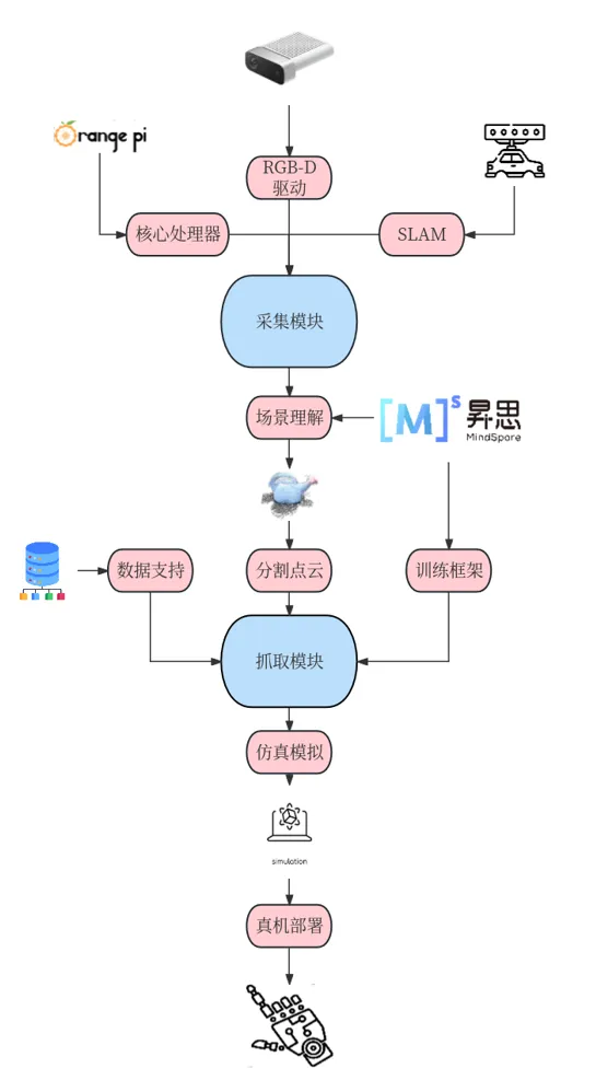 在项目申请书的原计划中,本预计使用 shadow hand 作为主要外设完成相关抓取任务。但是后续因为灵巧手过于脆弱发生损坏,设备返英国原厂维修,并且因为产权问题,不再能被本项目使用。于是使用了结构更加简单的开源六自由度夹爪机械臂作为替换。但是项目的基本方案还是与原先保持了一致,方案流程图见图1。项目目标可以划分为多个子任务: