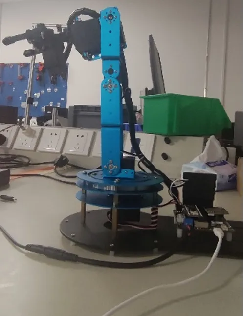 完成了对开源六自由度机械手臂和平行夹爪的搭建,使用stm32作为机械手臂的主控芯片, 与香橙派通过串口通讯对机械手臂进行控制。机械手臂实物图见2。