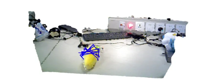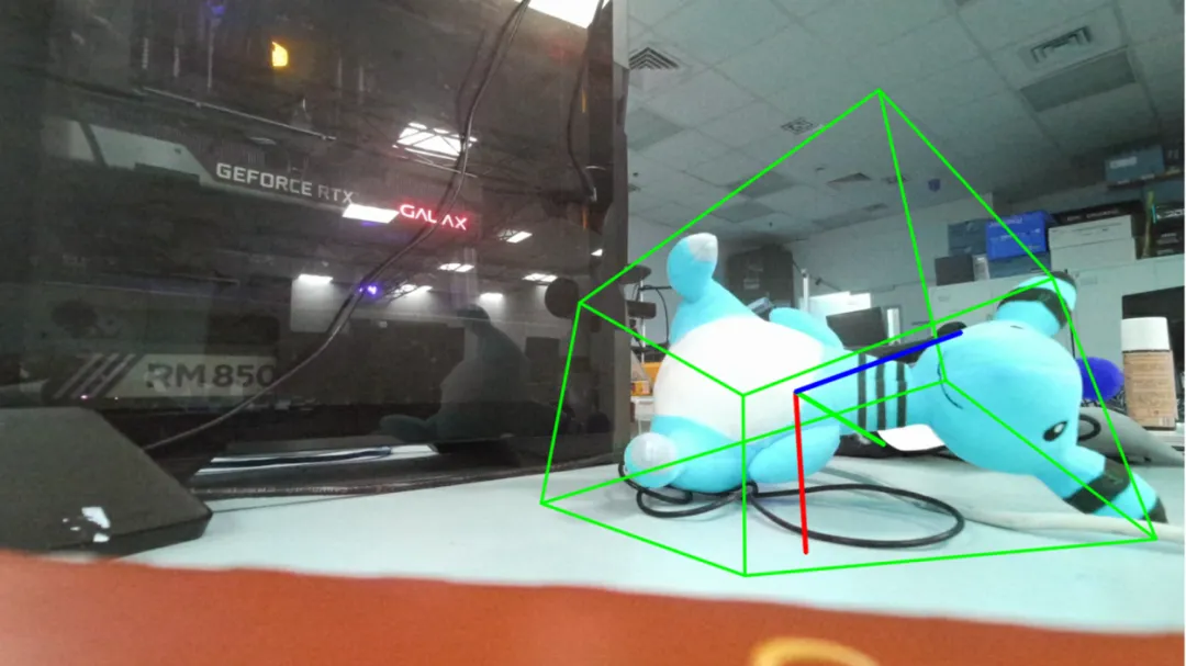 对于场景中的物体进行分割和追踪的前提往往是定位出一个具体法范围来使得模型能进行匹配,在这一步中本项目采用了 GroundingDINO 方法,这是来自于 ECCV2024 的新发布的最新的定位方法。而对于物体检测程序本项目使用到了较为简单的模式——通过已有的目标物体的模型进行匹配,这使得检测配准变得较为简单,但是为了保持后续扩展该项目时仍然可以做到模型无关的最终目的,项目中选取了来自 CVPR 的 FoundationPose 这一方法,既可以应对具有物体模型的场景进行精准匹配,也可以对没有模型的场景进行猜测重构,从而进行匹配。 在本项目中,虽然使用到了目标物体的模型,但是由于设备受限,只能采集物体模型的几何信息,不能得到特征贴片,所以仍然缺乏颜色信息,在物体的追踪过程中,可以会出现对于一些对称结构的物体,发生过度矫正而产生的晃动,旋转,偏移这样的现象。所以在该项目中,尽量使用了几何特征纹理复杂,且对形变的鲁棒性较高的玩偶模型来进行追踪,图5为实验中对玩偶的位姿的检测和追踪。