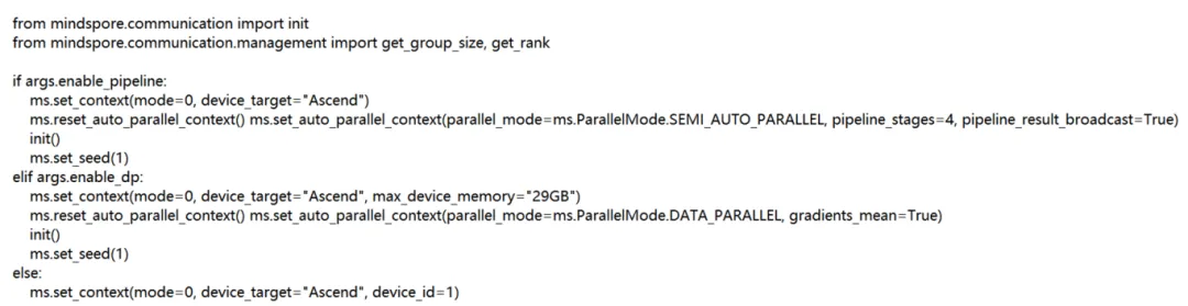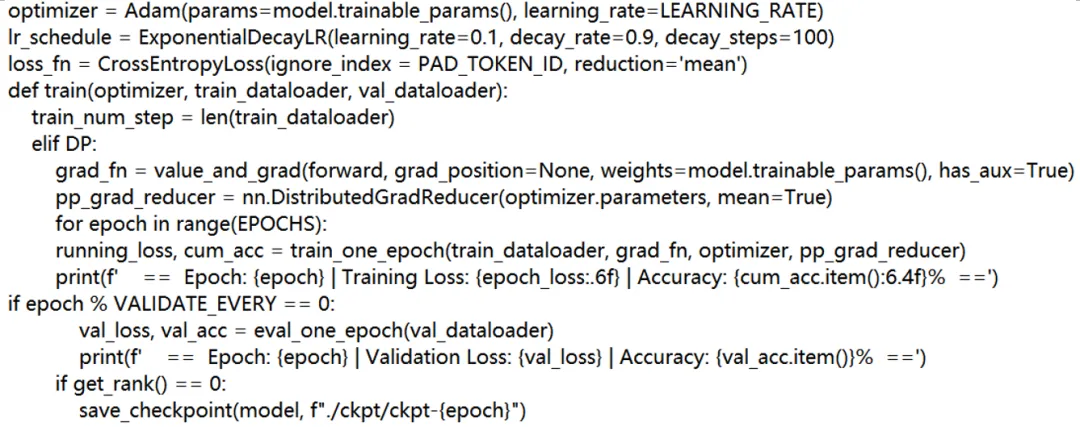 在 PyTorch 中,设备的选择是通过 torch.cuda.set_device() 来指定每个进程使用的 GPU 设备,并通过 torch.device() 将设备分配给变量 device,而在 MindSpore 中,这部分操作则通过 ms.set_context() 来指定设备。对于分布式训练,PyTorch 使用 torch.distributed.init_process_group() 进行初始化,而 MindSpore 则对应使用 mindspore.communication.init(),并且通过 get_group_size() 和 get_rank() 替代 PyTorch 的 get_world_size() 和 get_rank() 来获取分布式环境中的进程数量和当前进程的 rank。PyTorch 中可以直接通过导入 DDP(DistributedDataParallel)实现数据并行,而在 MindSpore 中则不能直接导入,取而代之的是使用 set_auto_parallel_context() 提供类似的并行控制机制。在 MindSpore 中,我选择了 Pipeline 流水线并行或数据并行两种模式来替代 DDP 实现分布式训练,并且增加了非分布式的模式。PyTorch 使用 seed_all() 为每个进程设置独立的随机数种子,而 MindSpore 则使用 ms.set_seed(),该函数会将种子应用到框架内所有的随机操作中。最后,MindSpore 中的 ms.set_context() 还可以指定 Ascend 设备的内存限制。