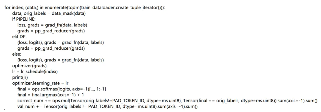 在训练循环中,PyTorch 使用 train_loader 的循环方式通过 enumerate 直接获取数据,而在 MindSpore 中则通过 train_dataloader.create_tuple_iterator() 来获取数据。对于张量操作,PyTorch 中的 logits.transpose(1, 2) 被替换为 MindSpore 中的 ops.softmax 和 ops.argmax。在梯度累积方面,PyTorch 使用 with model.no_sync() 来实现梯度累积,并在每次累积间隔后调用 backward() 和 optimizer.step(),而 MindSpore 则不再需要 no_sync 的概念,框架会自动处理并行时的梯度同步。精度计算方面,PyTorch 直接使用 torch.true_divide 来计算正确预测的比例,而在 MindSpore 中则使用 ops.mul() 及其他操作来计算 correct_num 和 val_num。为了确保所有节点的操作一致,PyTorch 通过 dist.barrier() 来同步进程,而 MindSpore 则通过 pp_grad_reducer 来处理并行的梯度同步。在学习率更新方面,PyTorch 使用 scheduler.step() 来调整学习率,而在 MindSpore 中则使用 lr_schedule 函数来控制学习率的更新,并将新的学习率分配给 optimizer.learning_rate。整体而言,MindSpore 在训练数据迭代、张量操作、梯度累积与同步、精度计算以及学习率调度等方面与 PyTorch 存在显著差异,提供了其特有的实现方式以支持高效的分布式训练。