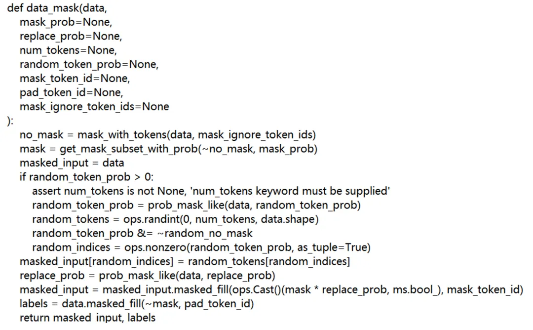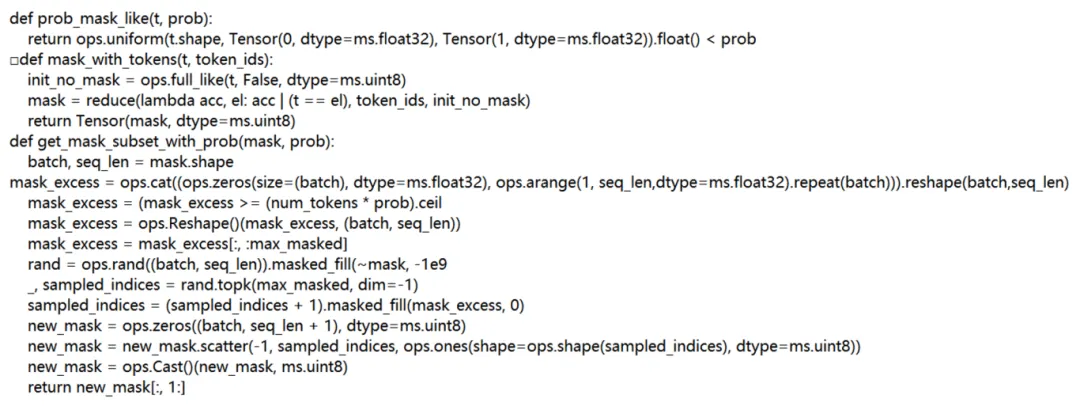 在随机数生成方面,PyTorch 的 torch.randint 被替换为 MindSpore 的 ops.randint 用于生成随机数;获取非零元素时,torch.nonzero 被替换为 ops.nonzero。在掩码填充过程中,MindSpore 需要通过 ops.Cast() 将布尔类型转换为 MindSpore 的布尔张量类型。此外,在 MindSpore 中不需要显式指定设备,设备的分配由框架自动处理。