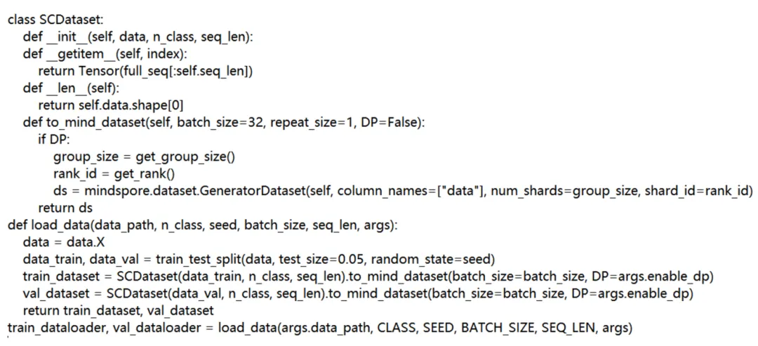 首先自定义了一个数据集,在 PyTorch 中,SCDataset 继承自 torch.utils.data.Dataset,而在 MindSpore 中,没有 Dataset 类继承,只能使用 GeneratorDataset 来封装数据集。数据在 PyTorch 中通过 torch.from_numpy() 转换为 PyTorch 张量并发送到指定设备 (device) 上,而在 MindSpore 中,则使用 mindspore.Tensor() 替代 torch.from_numpy(),且无需显式指定设备,因为 MindSpore 会自动处理设备分配。SCDataset 类的构造函数在 PyTorch 中仅接收 data 参数,而在 MindSpore 中增加了 n_class 和 seq_len 两个参数,以指定类别数量和序列长度,从而提高数据集的灵活性,能够根据不同设置调整类别数和序列长度。在数据提取方面,PyTorch 使用 random.randint() 随机获取起始点并从该位置开始提取数据,而 MindSpore 则通过直接索引获取指定位置的数据,且返回数据的长度被限制为 seq_len。在数据加载和分布式数据采样方面,PyTorch 使用 DataLoader 和 DistributedSampler,而 MindSpore 则使用 GeneratorDataset 替代 DataLoader 来加载数据,并支持数据并行(DP)模式,通过 num_shards 和 shard_id 实现分片。为了支持分布式训练,MindSpore 使用 to_mind_dataset() 方法替代 DistributedSampler 实现数据并行功能,利用 mindspore.dataset.GeneratorDataset 生成数据集,并根据是否启用数据并行 (DP=True/False) 选择是否对数据集进行分片,通过 get_group_size() 和 get_rank() 实现数据分片。在批次处理方面,PyTorch 的 DataLoader 直接指定 batch_size 参数,而 MindSpore 则通过 to_mind_dataset 方法将数据转换为 GeneratorDataset,并在调用时指定 batch_size 和 DP。整体而言,MindSpore 在数据集封装、设备分配、数据并行及批次处理等方面与 PyTorch 有显著的不同,提供了其特有的实现方式以支持分布式和非分布式的训练模式。