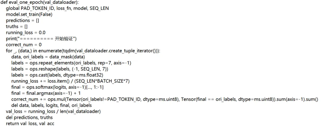 在模型评估过程中,PyTorch 使用 model.eval() 将模型设置为评估模式,从而关闭 dropout 和 batch normalization 的影响,而在 MindSpore 中,等效的方法是使用 model.set_train(False)。PyTorch 中通过 torch.no_grad() 来关闭梯度计算,而 MindSpore 默认在验证过程中不会计算梯度,因此无需显式调用该步骤。此外,PyTorch 需要显式调用 data.to(device) 将数据移动到 GPU 或 CPU,而 MindSpore 则自动处理设备管理,无需手动指定。在张量操作方面,PyTorch 的 nn.Softmax(dim=-1) 被替换为 MindSpore 的 ops.softmax 操作,维度操作如 .transpose 在 MindSpore 中需要使用 ops.repeat_elements、ops.reshape() 和 ops.cast 来实现。对于最终的预测结果,PyTorch 中的 final.argmax(dim=-1) 被 MindSpore 的 ops.argmax(axis=-1) 所替代。在计算准确率时,PyTorch 通过张量比较 predictions == truths 来计算正确的数量,而在 MindSpore 中则使用 ops.mul 进行相应的计算。整体而言,MindSpore 在模型评估模式设置、梯度计算控制、设备管理以及张量操作等方面与 PyTorch 有显著的差异,提供了其特有的实现方式以支持高效的模型评估流程。