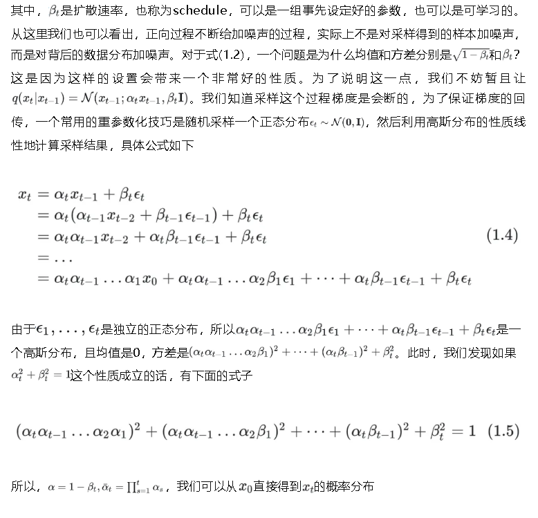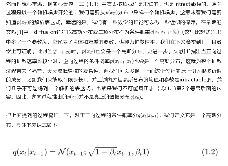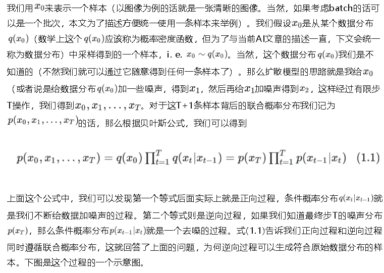 这类模型核心在“扩散”两个字。diffusion模型整体上分为两个过程,正向扩散过程和逆向扩散过程。以图像为例,我们给清晰的图像不断地加入噪声,经过有限步长之后,把这张清晰的图像变成一个噪声的分布(一般是高斯分布),这个过程就是正向扩散的过程。那么可以猜到,逆向扩散过程则是以采样一个随机噪声为起点,不断地“去噪”,经过有限步之后生成一张清晰的图像。虽然当前diffusion有大量的变种,但基本都不会脱离这两个过程。初看这个思路的时候会产生一个问题,这个逆向过程凭什么可以做到这一点呢?为了解释这个问题,我们需要对diffusion背后的数学原理有一些了解。因此,下面用形式化的数学语言来表示diffusion的建模思路。