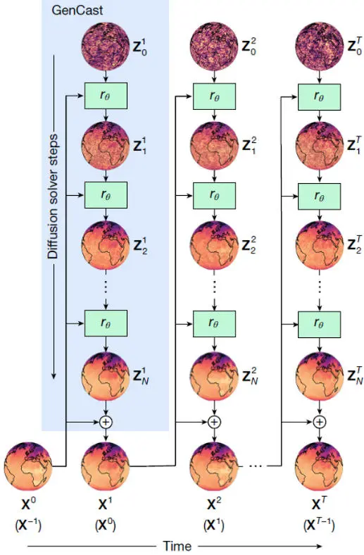 关于GenCast的模型结构我在这里放一下原文推理过程的模型结构图,这是一个典型的diffusion去噪的过程图。GenCast的思路是利用过去2个时间步的输入来预测下一个时刻的预报结果,然后再把下一个时刻的预报结果做为输入,滚动预报,直至预报未来15天的天气。单个时刻的预报前向20次,也就是下图中N=20,而时间分辨率是6小时,故T=15*4=60。