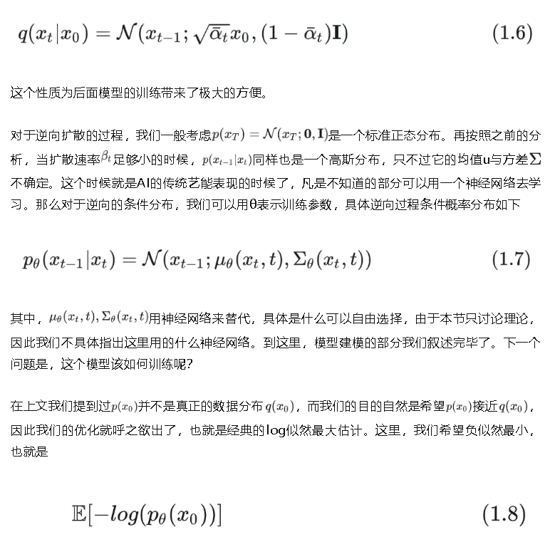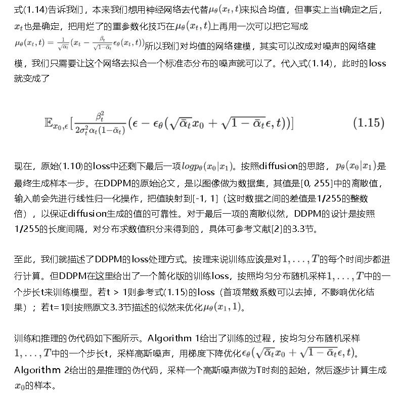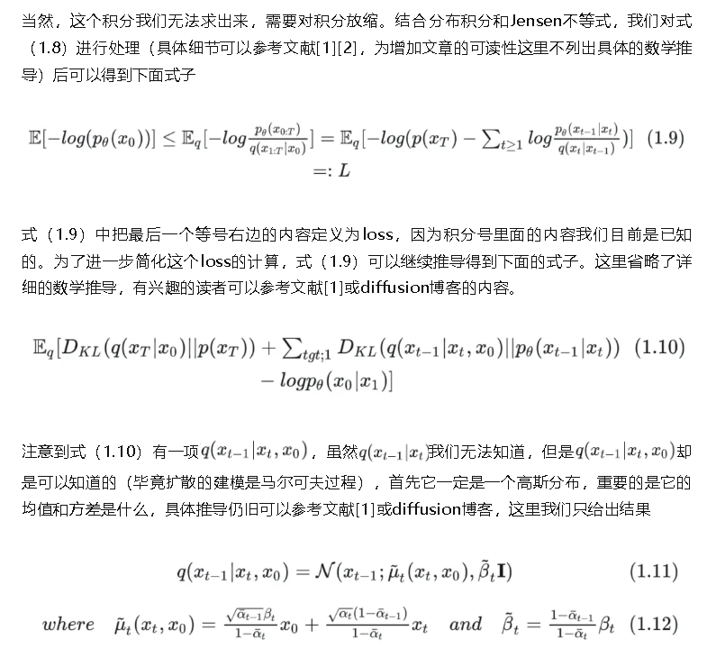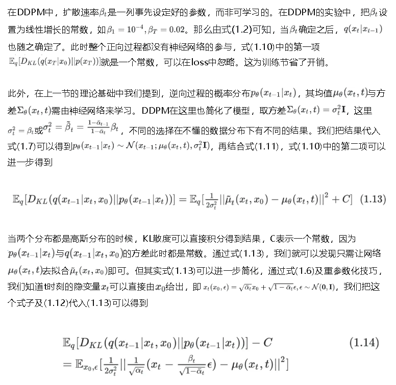 通过式(1.6), (1.7), (1.11), (1.12)我们可以去计算式(1.10) loss。至此,我们给出了diffusion模型的基本理论基础和建模思想。