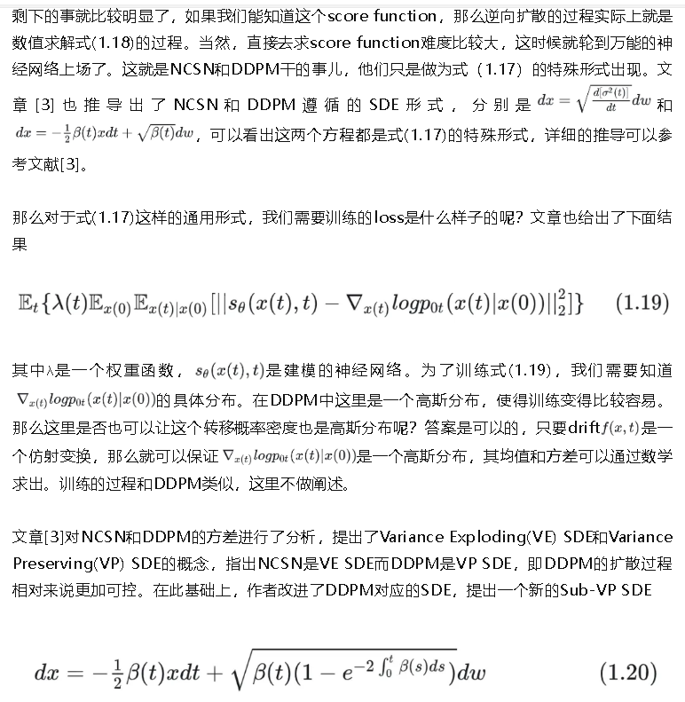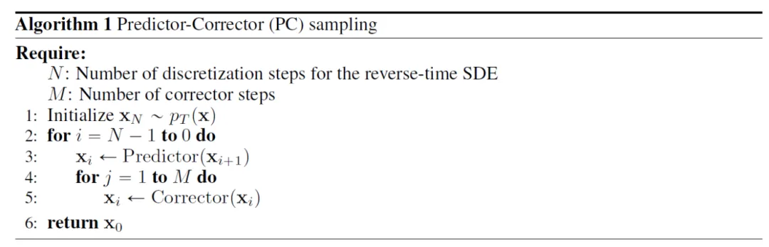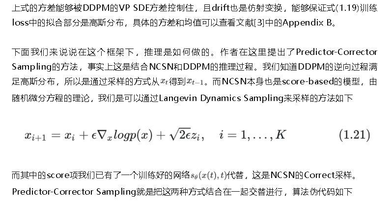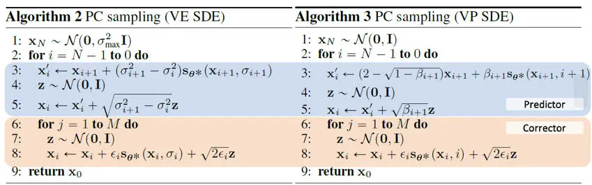 对于sampling的过程,除了上述对逆向SDE进行sampling之外,作者还提出了一个probability flow ODE的概念。对于初始SDE(1.17),我们也同样可以写出对应的逆向形式,可以参考文献[3]的Eq17. 对应的递归公式与上面Algorithm 2/3相似,在predictor中的递归公式中,网络部分前面增加1/2做为系数。
