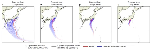 此外,GenCast还预测了一个下游任务,也就是台风路径预测。论文以2019年登陆日本的Hagibis台风做为case进行预测,预测路径如下图所示。可以看出GenCast预测的台风路径随着预报时间的临近越来越“收敛”于EAR5的结果。