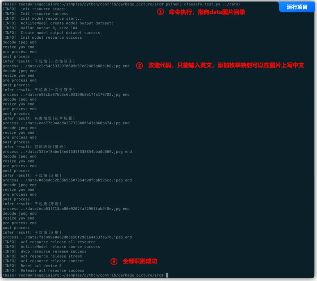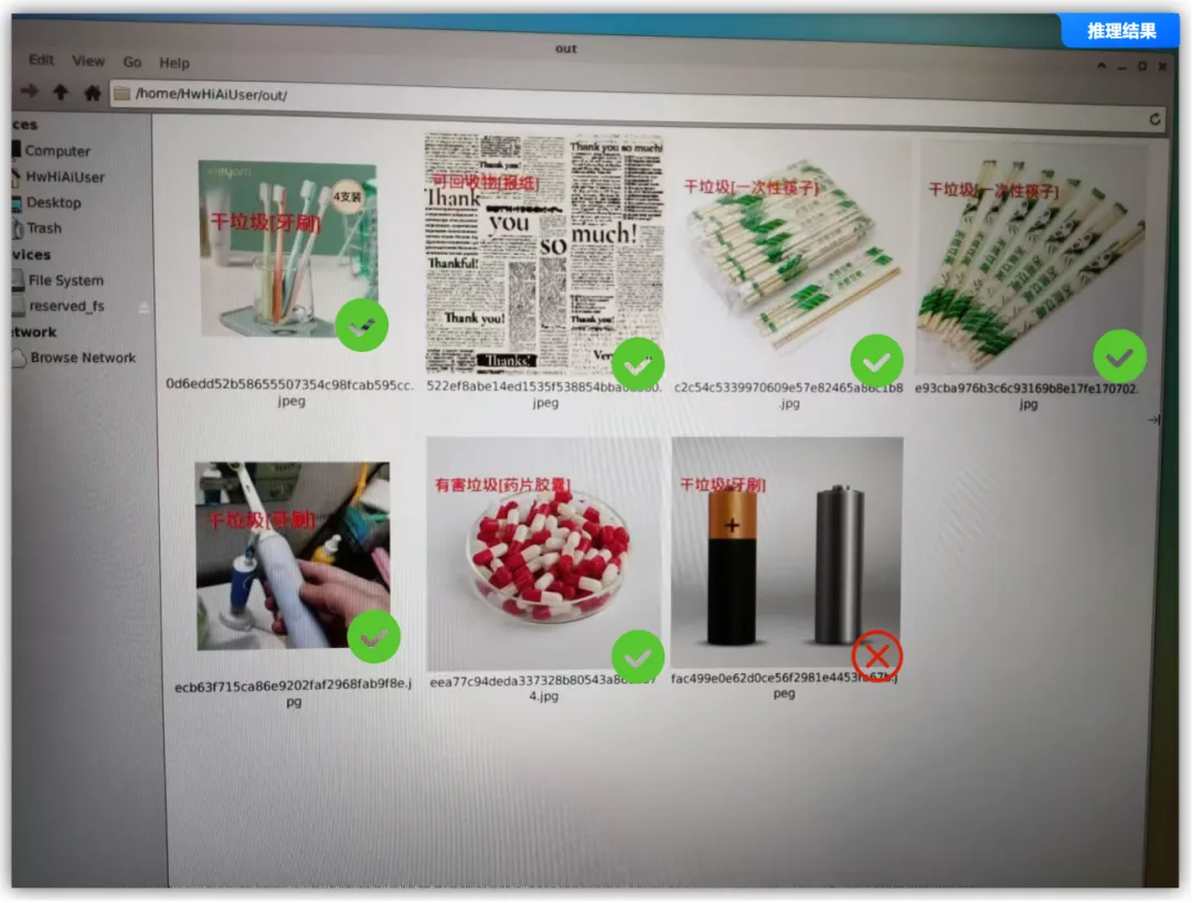 总结,通过上面的实验,可以看到我们可以很好的在香橙派OrangePi AIpro上运行基于MobileNetV2垃圾分类项目,可以看到有一个电池的图片没有识别正确,其他都正确,识别的结果为“牙刷”,可以增加多一点的图片,再自己训练一下。