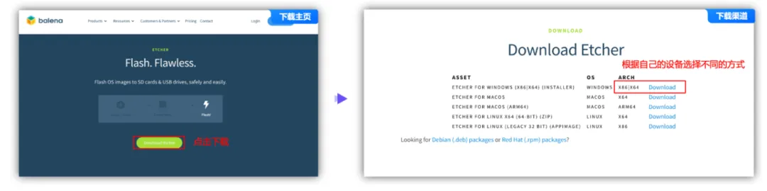 首先打开balena烧录工具地址,因为个人办公是Mac电脑,借用了同事的Windows电脑来进行此次的测试,我们选择OS为“WINDOWS”的X86|X64版本下载。