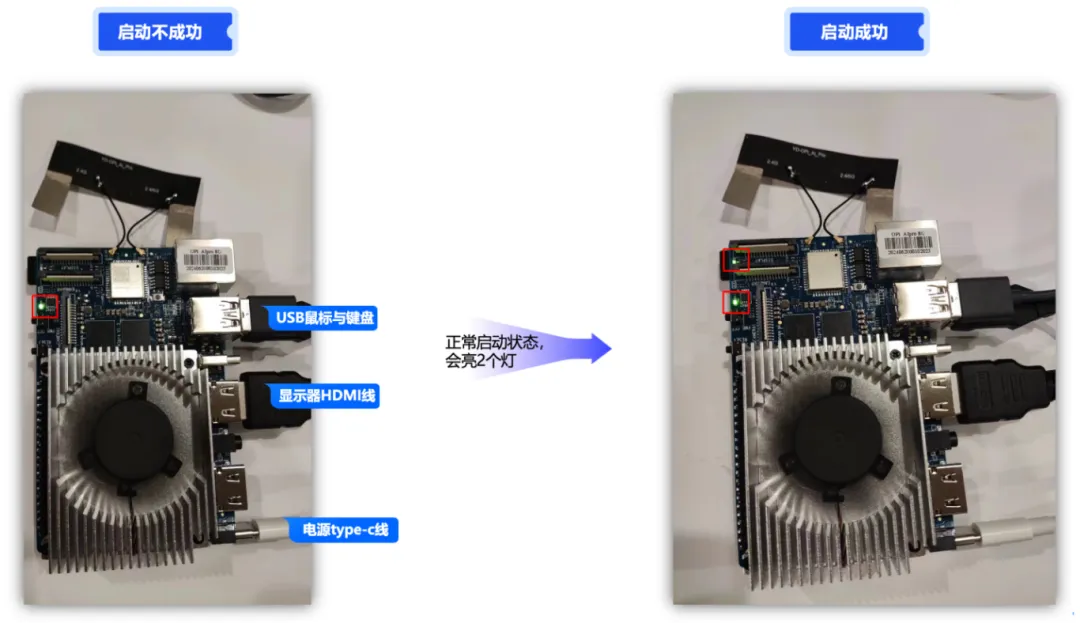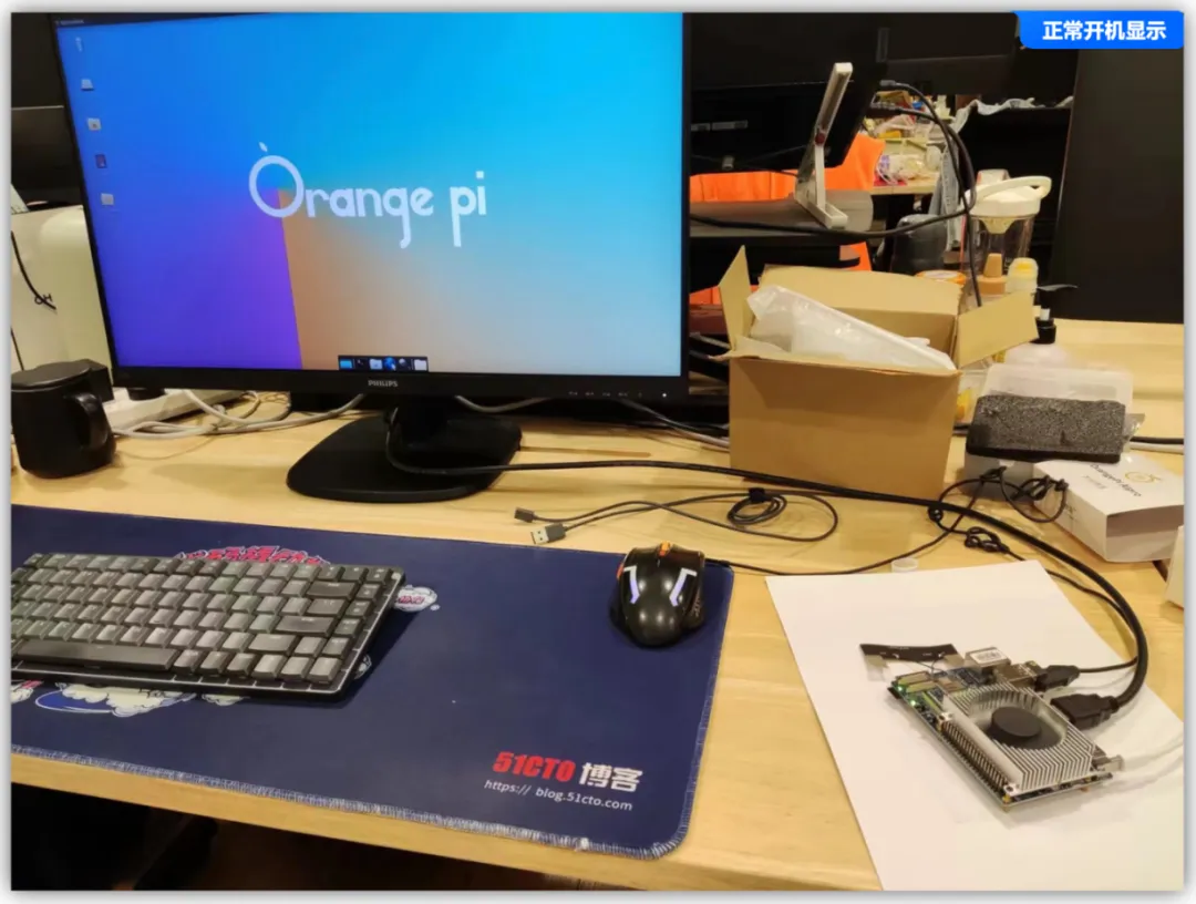 插入USB的鼠标和键盘、显示器HDMI线、自带的type-c电源线后,即可以去插上电源了,一插入就自动启动了,没有什么开机键,即一通电就自动启动,但是有一个问题,等了5分钟除了风扇一直响外,显示器一直不显示,猜测是之前的烧录有问题。