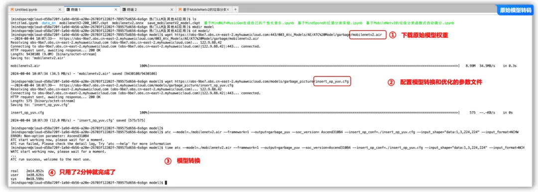 ③将MobileNetV2模型从PyTorch格式转换为ONNX格式,然后再进一步转换为适用于Ascend310芯片的模型格式,最终生成了mobilenetv2.air文件。