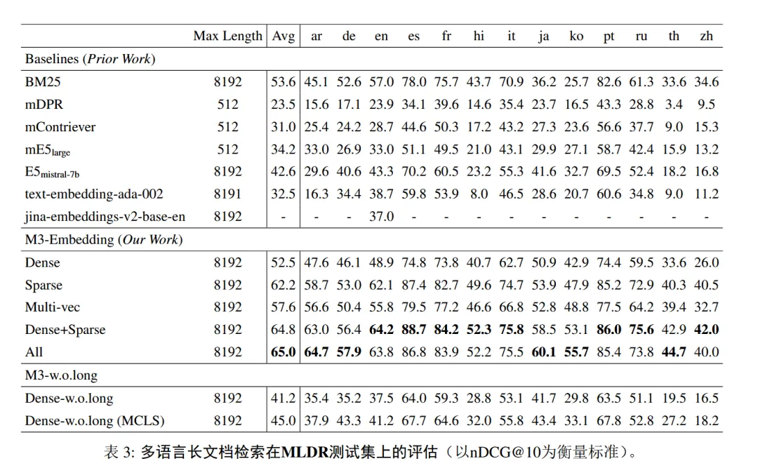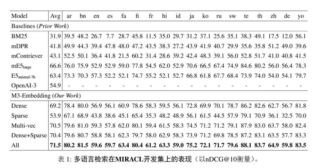 **1、MIRACL数据集:**该数据集包含18种语言的检索任务。M3-Embedding在密集检索(Dense Retrieval)、稀疏检索(Sparse Retrieval)和多向量检索(Multi-Vector Retrieval)三种检索任务中均取得了优异的成绩。例如,在nDCG@10的评估指标下,M3-Embedding的平均得分为71.5,显著优于其他方法。