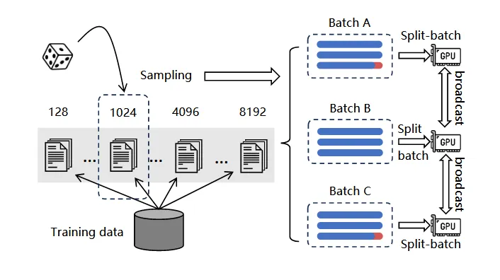 数据按长度分组并采样。启用梯度检查点和跨GPU广播以节省内存。