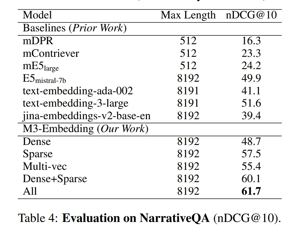 **3、MLDR和NarrativeQA:**M3-Embedding还在长文档检索任务中表现出色。在MLDR和NarrativeQA等长文档数据集上,M3-Embedding通过多功能检索的结合,实现了对长达8192个令牌文档的高效处理,进一步验证了其在长文档场景下的优越性。