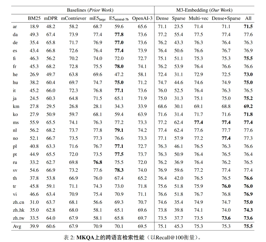 2、**MKQA数据集:**在25种语言的跨语言检索任务中,M3-Embedding同样表现出色。在Recall@100评估指标下,M3-Embedding的得分为75.5,远超大多数现有模型,尤其在低资源语言(如阿拉伯语、希伯来语等)中表现尤为突出。