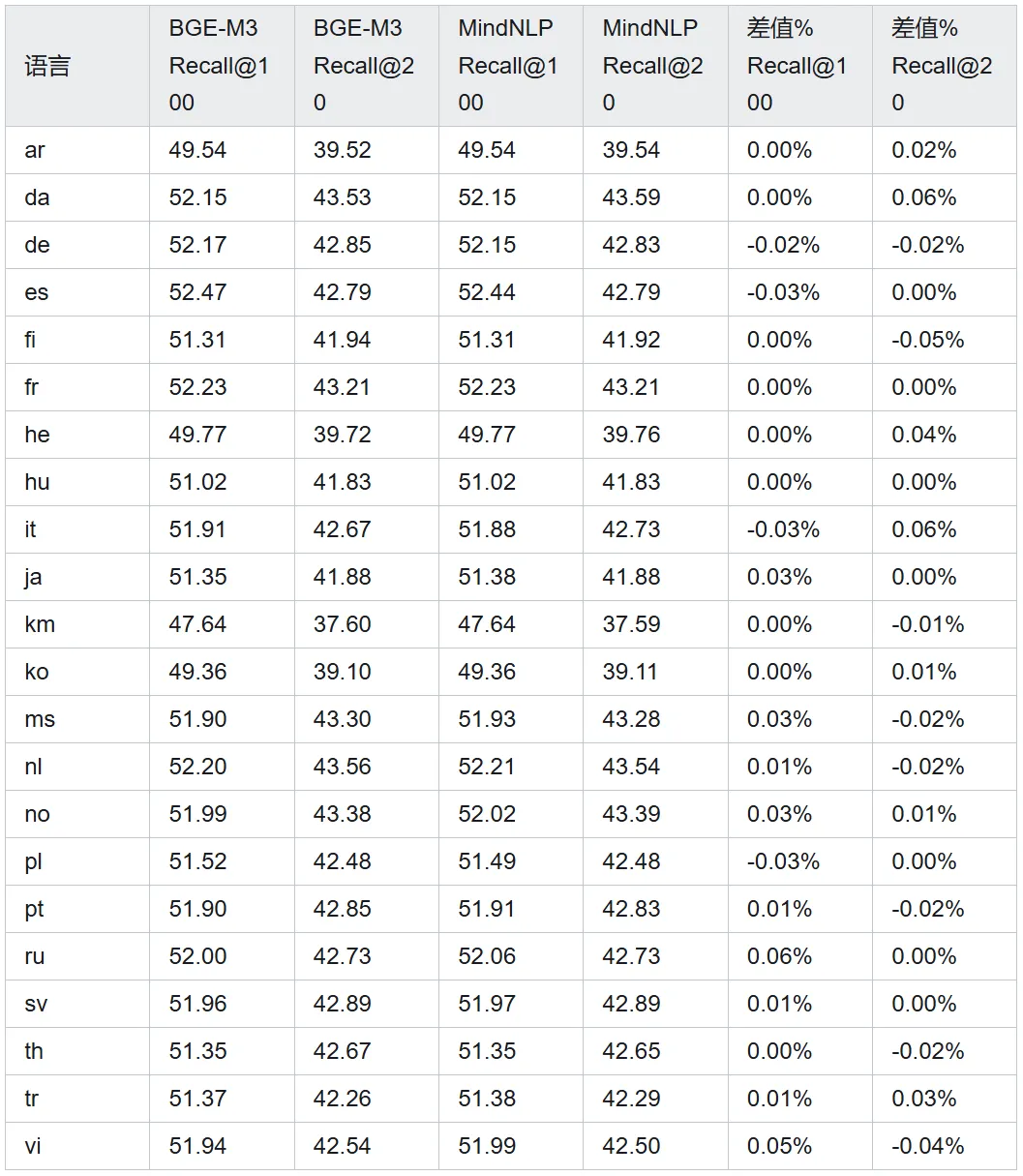 对于MindSpore NLP的bge_m3实现,我们使用了官方相同的MKQA基准来评估bge_m3模型的跨语言检索性能。MKQA基准包含了25种非英语语言的查询,每个查询任务都需要从英文维基百科语料库中检索包含答案的段落。为了进行这一实验,我们利用了BEIR提供的精心处理过的语料库BeIR/nq,并采用了密集检索(Dense Retrieval)方式。主要的评价指标包括Recall@100和Recall@20。整个测试过程均与官方相同。