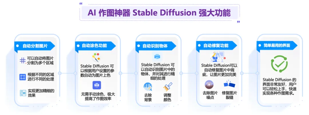 Stable Diffusion 可以通过生成多样化、高质量的图像、修复损坏的图像、提高图像的分辨率和应用特定风格到图像上等方式,辅助视觉创意的实现,它为视觉艺术家、设计师等提供更多的创作工具和素材,促进视觉艺术领域的创新和发展。