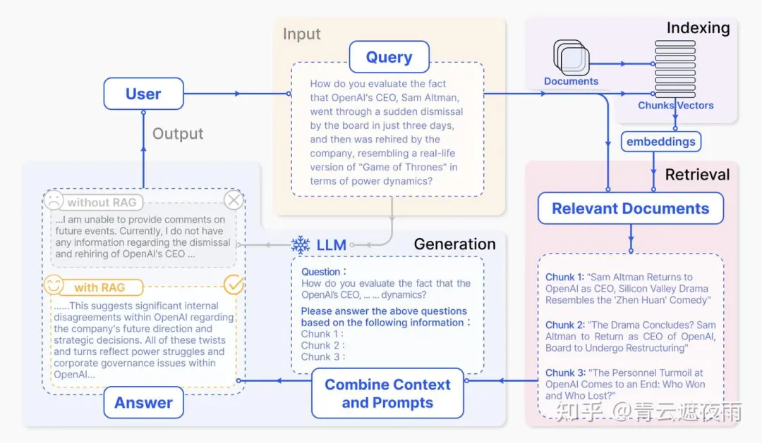 微调固然效果好,可以让模型真正的“学会”一些私域知识。但是微调也会带来几个问题:首先,由于生成模型依赖于内在知识(权重),因此模型还是无法摆脱幻觉的产生,在对理解门槛高且准确性要求严格的场景下,这就是完全无法接受的,因为用户很难从回答的表面看出模型是否是在胡说八道。其次,在真实场景中,每时每刻都在产生大量数据,对一个事物的概念会迭代的飞快,如某个政策的解读、某个指标的调整等。而模型微调并不是一个简单的工作,无论是从数据准备、算力资源、微调效果、训练时间等各个角度来看,随时用新产生的数据来进行微调都是不现实的,且最终微调的效果也无法保证,能够做到每月更新一次都已经是很理想的状态。最后,对于超大型的大语言模型来说,频繁微调的成本是难以承受的。 - 检索增强生成(RAG):
