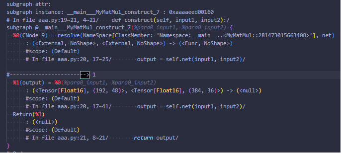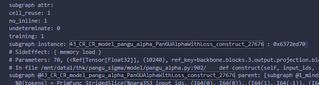 如下图所示,在 subgraph instance 这个属性后跟着的就是子图的名称 43_CR_CR_model_pangu_alpha_PanGUAlphaWithLoss_construct_27676, 其使用通常以 call @43_CR_CR_model_pangu_alpha_PanGUAlphaWithLoss_construct_27676 的形式存在