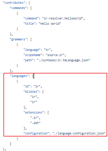 当前 IR 图只支持 .ir 类型,我们需要在 package.json 文件的 contributes 中添加 languages,来支持 .ir 文件,否则无法触发。