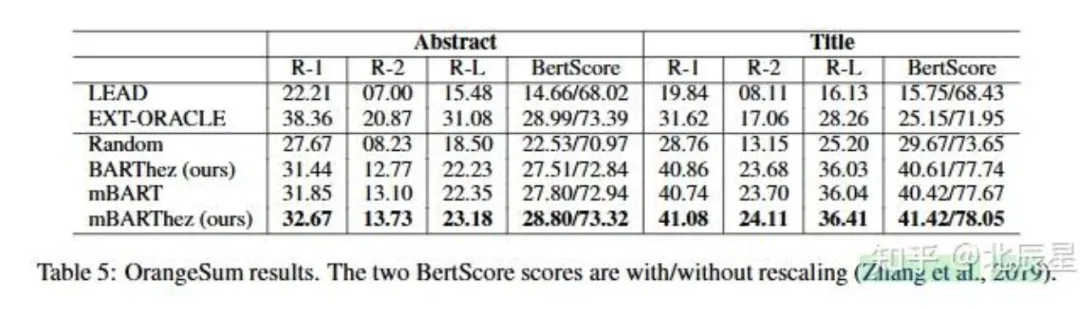 在本文推出的OrangeSum数据集上分别进行摘要生成和标题生成两个任务,使用ROUGE-1、ROUGE-2和ROUGE-L分数作为指标,而由于ROUGE在抽象摘要中不适用,所以又加入了BERTScore分数,其运行对比结果在下表。