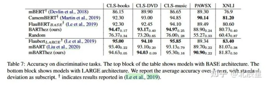 在5个任务中的3个任务中,FlauBERT比mBARThez略有优势,这可能是因为FlauBERT在单语法语语料库上训练的时间大约是mBARThez的10倍。总的来说,BARThez和mBARThez在生成任务上的出色表现并不会导致它们在判别任务上的性能下降。