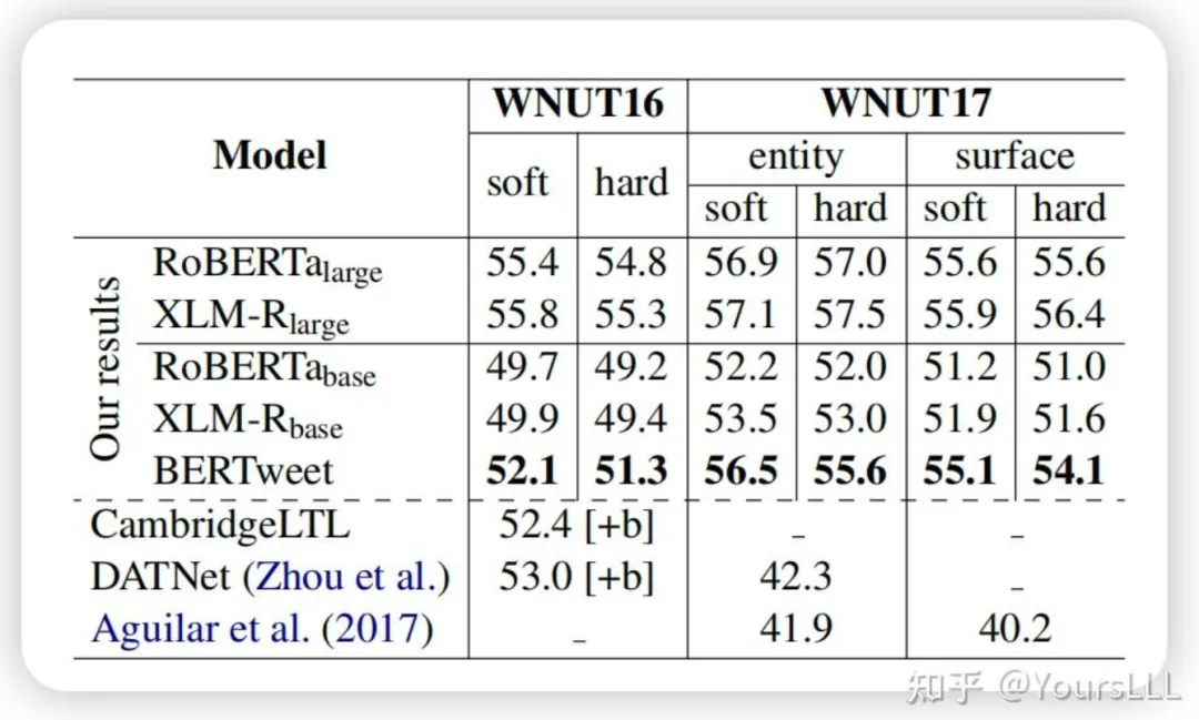 **命名实体识别(NER):**在WNUT16和WNUT17数据集上,BERTweet的F1分数为52.1%和56.5%。