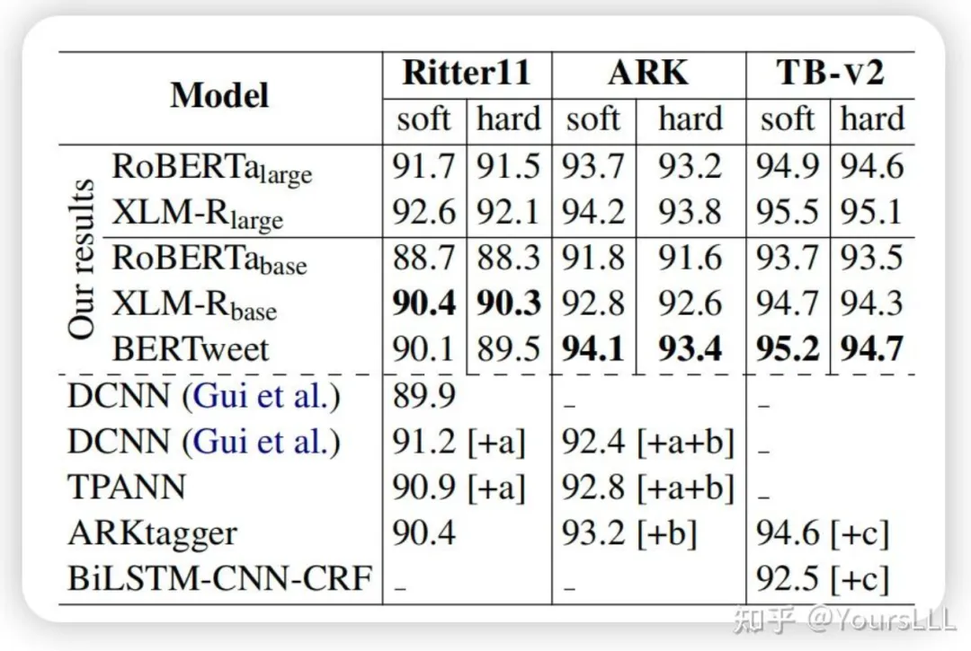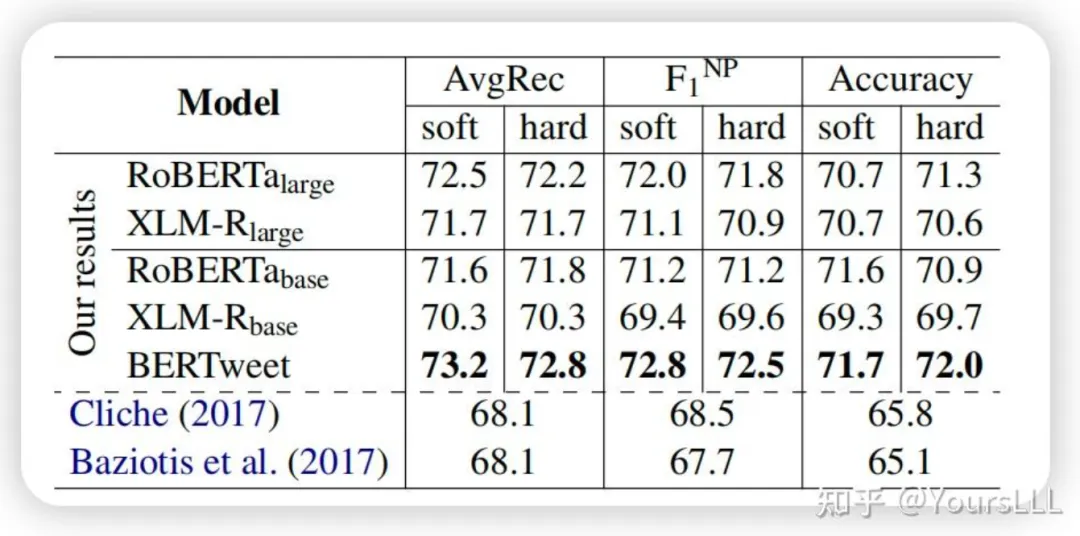 BERTweet在不同推文数据集上的主要任务评价指标表现如下: