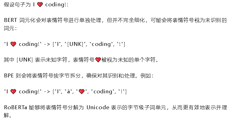 RoBERTa:采用 BPE 子词词元化算法,以更细粒度的字节级别进行分词。像Emoji这样的特殊字符也会被分为多个字节级子词。这样,RoBERTa 可以处理更广泛的文本格式,包括非常见字符和表情符号。在Bertweet的数据训练主要来源于推文,在我的理解中,BPE对于Bertweet相当于关键的心脏部分。