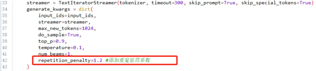 需要将generate_kwargs(第34行)中添加repetition_penalty=1.2,即可解决长文本输出重复问题:
