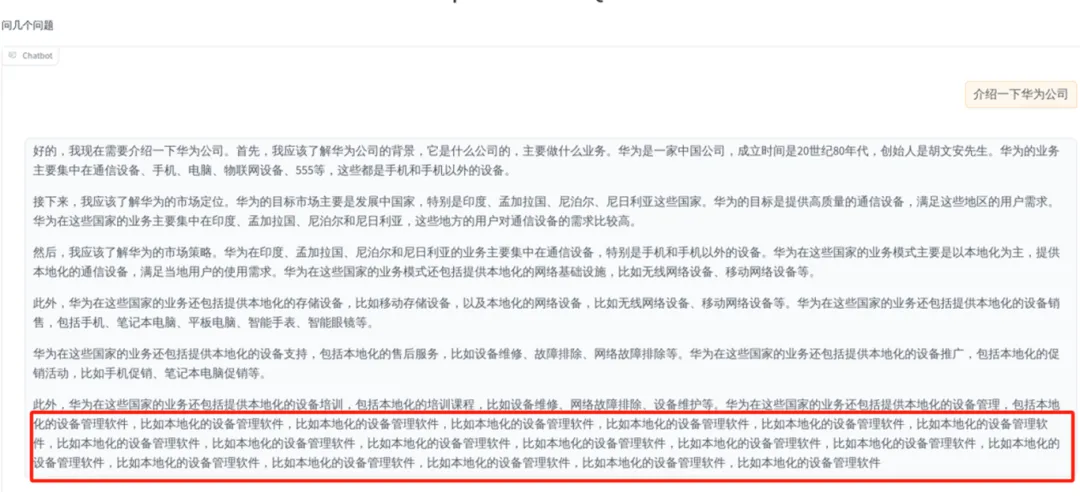 在进行长文本输出的过程当中,输出回答到一定长度后模型会输出重复内容,如图所示: