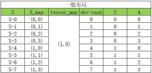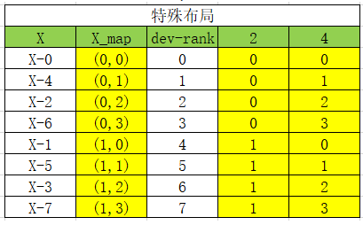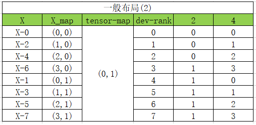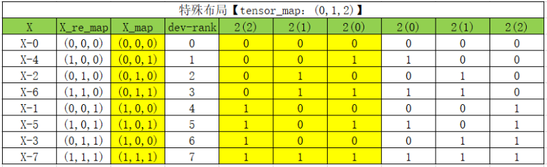由于这里的 tensor-map 是(0,1) 与 device matrix 的默认编号(1,0) 不同,所以X_map 这里需要做一个映射。因此, X_map 这一列的值与设备矩阵最右侧的排列是相反的。