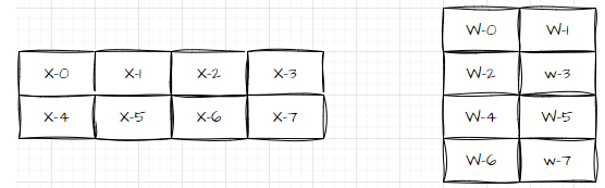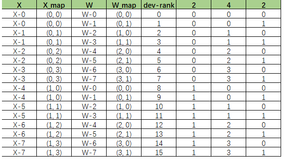 【某观众】:(这是弄啥嘞?)X-0 -> W-0, X-1 -> X-1, ... , 【小章哥哥】:现在我们要给 X 和 W 找到对应的设备的 rank,我们先画把 rank 按顺序写出来: