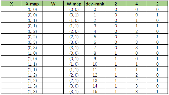 类比地,对于低维 tensor,其索引为 k2,k3k2,k3, 其对应的 rank 索引为 [0−k1]∗(m2∗m3)+k2∗m3+k3[0−k1]∗(m2∗m3)+k2∗m3+k3。我们以 W-3 为例做一下演算,其坐标为 [1, 1], 则有其rank 索引为 [0,1]∗(2∗4)+1∗2+1[0,1]∗(2∗4)+1∗2+1 = [3, 11]。 【小章哥哥】:当然,这里我只是做了简单的讲解,深度比较浅,有兴趣继续探索的同学可以参考者自己查阅 mindspore 的源码。 这样,我们就可以得到如下的表,得到 X 和W 每个部分在设备上的分布了