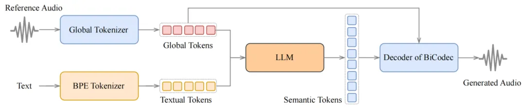 Spark-TTS的语言模型采用解码器-仅变压器架构,与典型的文本语言模型统一。它使用预训练的文本LLM Qwen2.5-0.5B作为骨干模型。Spark-TTS不需要流匹配来生成声学特征,而是通过BiCodec的解码器直接处理LM的输出,生成最终的音频。 Spark-TTS的语音合成流程如下图所示: