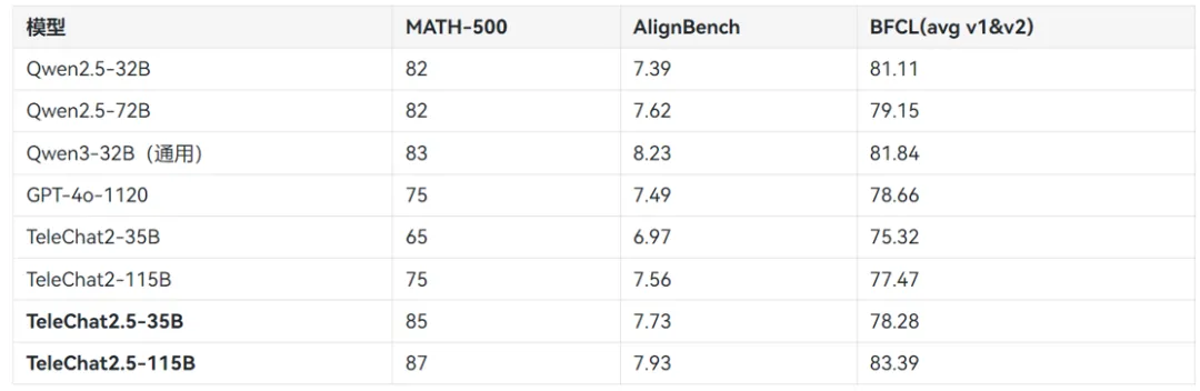 TeleChat2.5 是 TeleChat 系列新版通用问答模型,由中国电信人工智能研究院**(TeleAI)**研发训练,包括了 TeleChat2.5-35B 与 TeleChat2.5-115B。TeleChat2.5 基于最新强化的 TeleBase2.5 系列模型进行训练,在理科、通用问答、Function Call等任务上有显著的效果提升。TeleChat2.5 的微调方法延续了 TeleChat2 系列,具体请参考 TeleChat2(https://github.com/Tele-AI/TeleChat2)。