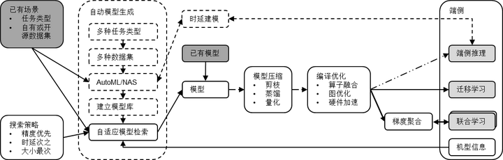 云侧训练-端侧推理,重点需要解决怎么生成最适合端侧的模型,包括模型压缩和自适应模型生成。模型压缩技术我们前面已经做了介绍。对于神经网络自动搜索(NAS),通常被用来生成满足一定限制条件(例如,微控制器上极致的内存限制)的模型,NAS技术最大的问题在于如何缩短搜索模型的时间。