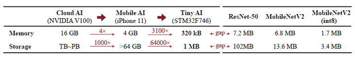 上面的表中,左边表示了云、手机、MCU上内存和存储的大小,右边表示了ResNet-50、MobileNet-V2、int8量化的MobileNetV2占用的存储和内存。