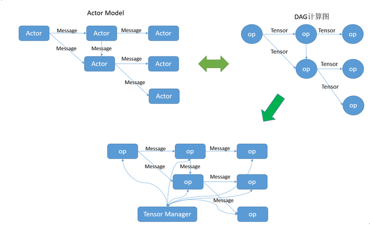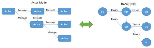 AI训练或者推理,最终都是执行一个DAG计算图,图中每个节点都是一个op,每条边都是一个(或一组)tensor。下面的图中,左边是actor模型的示意图,右边是一个AI计算任务示意图。