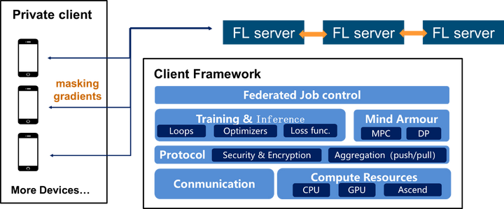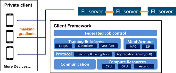 MindSpore的联邦学习方法,同时支持cross-device(ToC)和cross-silo(ToB)两种场景,在数据不出域的条件下,实现多方联合建模,以帮助企业应用提效降本,助力不同行业智慧升级。在安全性方面,MindSpore提供多种模型加密方式,可以适用于大规模无状态的终端设备,包括差分隐私、秘密共享、安全聚合等,用户可自定义安全等级。